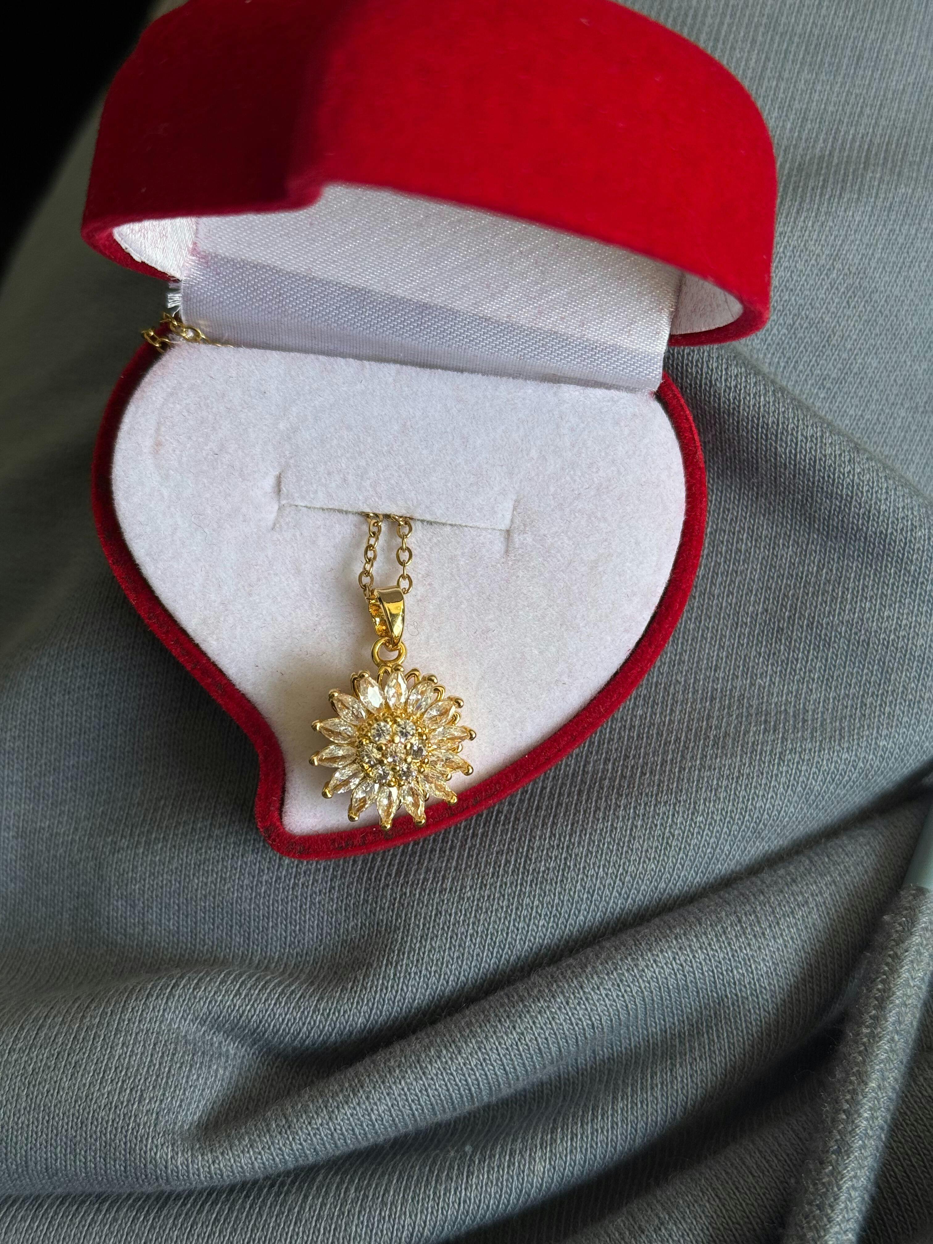 1 Collar de girasol giratorio en acero inoxidable 316L duradero con baño en oro 10k y dije en cobre galvanizado con baño en oro 10k